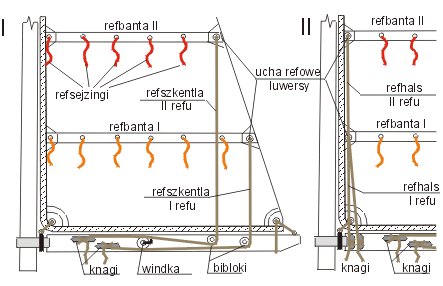 • refsejzingi - linki przechodzące przez remizki do wiązania żagla do bomu,